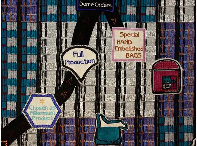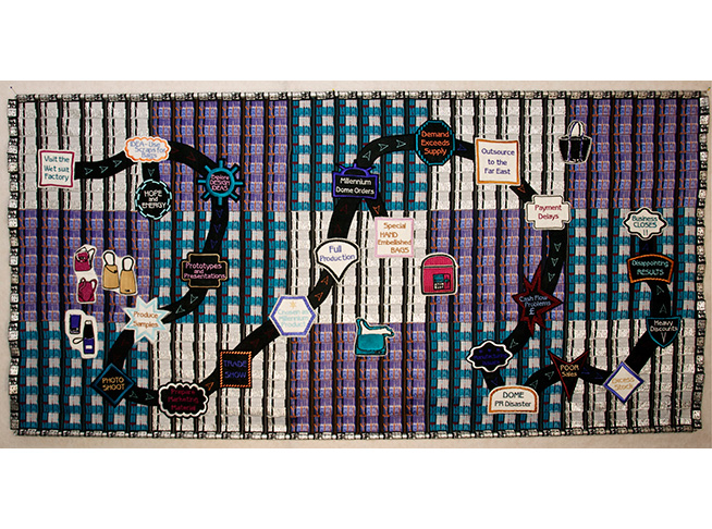 The story of this Business Journey is stitched out in comic book style onto a ground of unused bag labels from the closed business.