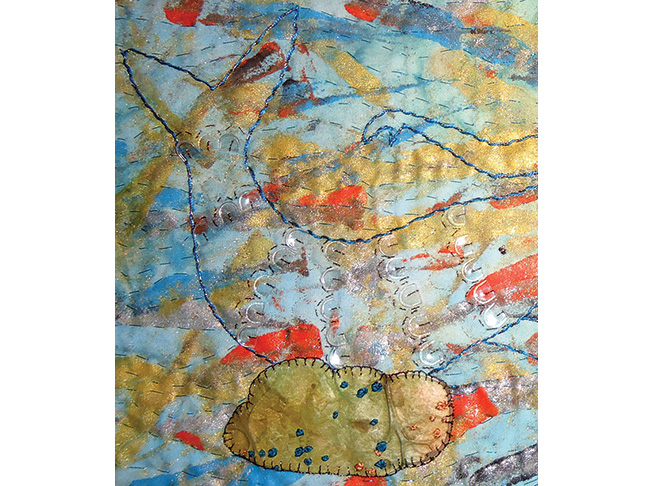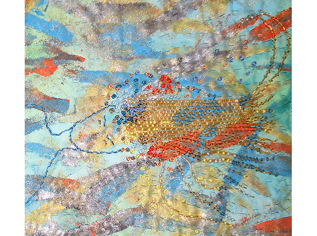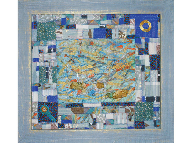 This mermaid is embroidered on hand painted fabric. Various techniques are used, including stitching of 'or nué' hair, appliqué rocks and fish scales and Kantha quilted water. The picture is bordered by patchwork of many fabrics and includes the mermaid’s mirror and ring in goldwork.