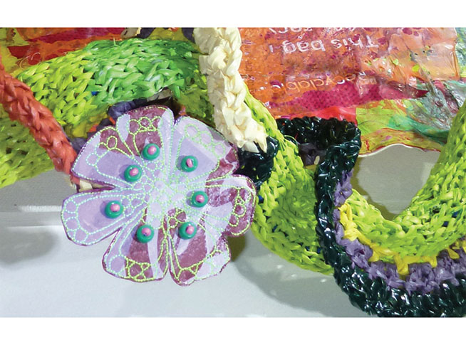 The fish and marine life were stitched onto yet more plastic bags, laminated onto a fabric base for strength, and decorated with plastic beads. Also included are pieces of beachcombed rope and other detritus from the sea.