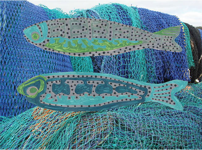 The work started by my drawing a variety of fish and marine life and painting them decoratively. I used the paintings, together with my own photographs, to make a sketchbook of composite pictures. This one is of painted herrings together with some fishing nets. The sketchbook provided inspiration for the final work.