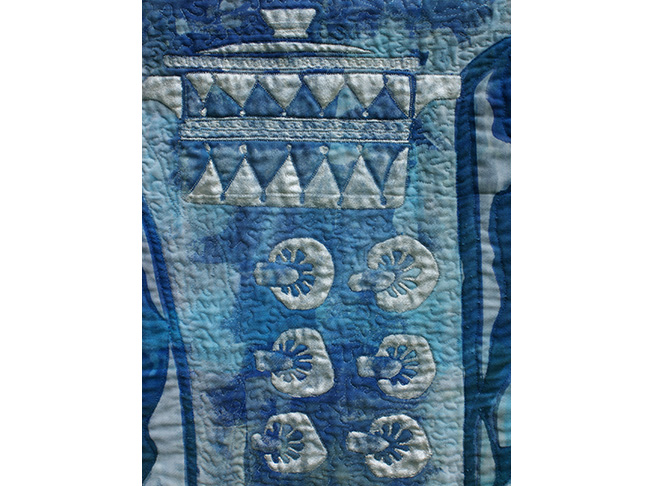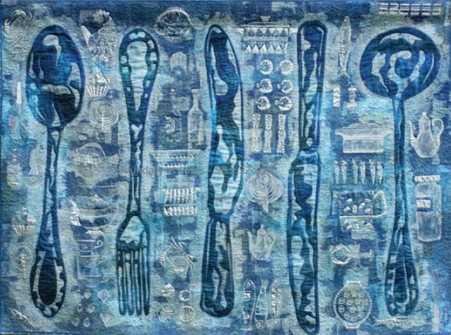 Oversized cutlery images on an old tablecloth are realised using procion dye and discharge paste. The machine quilted food and 1960’s cookware images are stitched in silver thread.